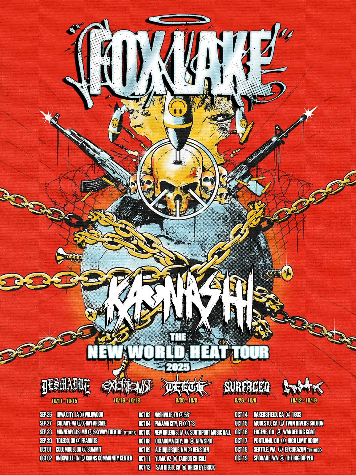 Além do lançamento, Fox Lake está prestes a embarcar na turnê principal “New World Heat”, com diversas bandas de suporte. Confira as datas e locais abaixo e garanta seu ingresso!