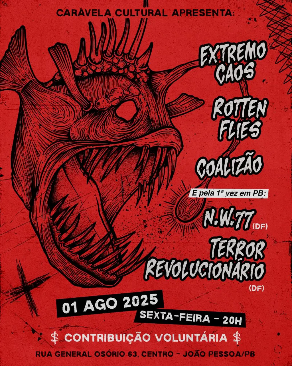 No próximo dia 1º de agosto, a Caravela Cultural traz para João Pessoa a energia do Crossover Thrash brasiliense com a banda N.W.77, que fará sua estreia na Paraíba. O evento acontece a partir das 20h, na Rua General Osório, 63, no Centro da cidade.