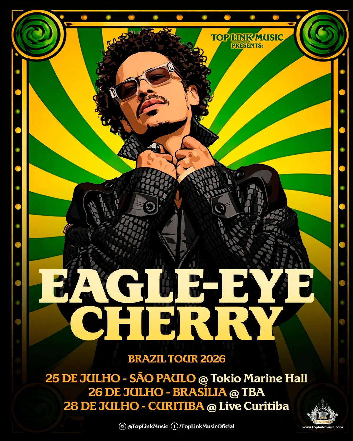 Eagle-Eye Cherry, el tipo detrás de los himnos globales “Save Tonight”, “Falling In Love Again” y “Are You Still Having Fun?”, vuelve a Brasil en 2026 para tres fechas en julio: São Paulo (25/07, Tokio Marine Hall), Brasilia (26/07, por confirmar) y Curitiba (28/07, Live Curitiba), dentro de la World Tour 2026. Con más de 4 millones de discos vendidos worldwide, esta vuelta celebra generaciones de fans y su conexión especial con el público brasileño, su lugar favorito para tocar. La produce Top Link Music.