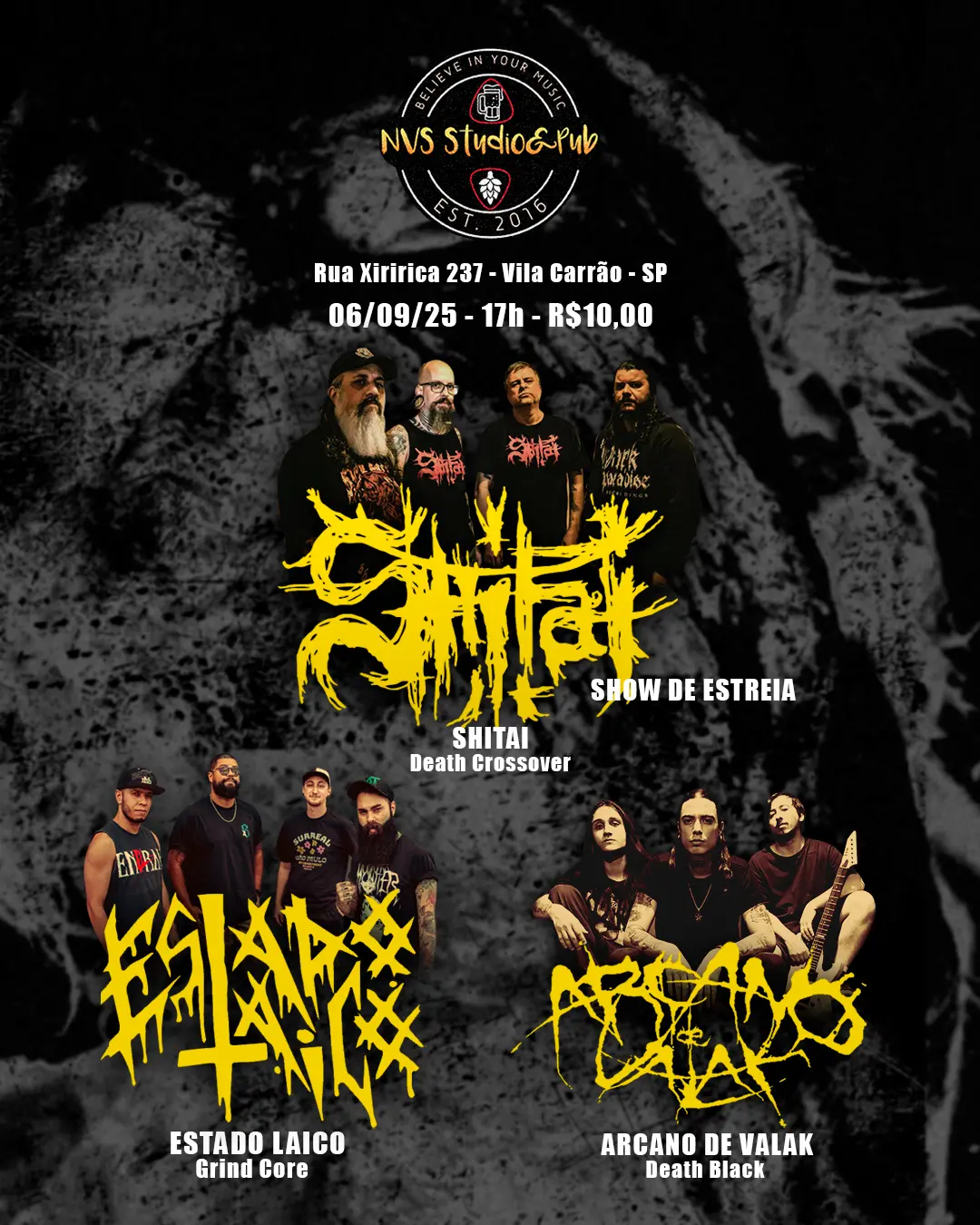 A aguardada estreia do SHITAI nos palcos já tem data, local e line-up definidos. A banda, que vem chamando atenção com seu Crossover/Death Metal cru e agressivo, se apresenta pela primeira vez no dia 06 de setembro de 2025, a partir das 13h, no tradicional NVS Studio & Pub (@nvs_studiopub), localizado na Vila Carrão, zona leste de São Paulo.